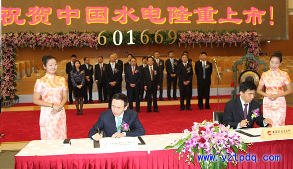 中國(guó)水電(股票代碼601669)首次公開(kāi)發(fā)行A股上市儀式10月18日上午在上海證券交易所舉行。中國(guó)電力建設(shè)集團(tuán)公司董事長(zhǎng)、中國(guó)水利水電建設(shè)股份有限公司董事長(zhǎng)范集湘,中信建投證券股份有限公司董事長(zhǎng)兼總裁王常青,中銀國(guó)際證券有限責(zé)任公司副執(zhí)行總裁任勁,國(guó)務(wù)院國(guó)資委副秘書長(zhǎng)閆曉峰先后致辭;范集湘董事長(zhǎng)與上海證券交易所副總經(jīng)理徐明簽訂上市協(xié)議書;國(guó)務(wù)院國(guó)有企業(yè)監(jiān)事會(huì)主席李志群和中國(guó)電力建設(shè)集團(tuán)公司董事長(zhǎng)、黨委副書記、中國(guó)水利水電建設(shè)股份有限公司董事長(zhǎng)范集湘共同為中國(guó)水電上市鳴鑼。