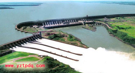 伊泰普水電站位于巴西與巴拉圭之間的界河——巴拉那河(世界第五大河,年徑流量7250億立方米)上,伊瓜蘇市北12公里處,是當(dāng)今世界裝機(jī)容量第二大,發(fā)電量最大的水電站。(裝機(jī)容量最大的是長(zhǎng)江三峽水電站,總裝機(jī)容量將達(dá)到2250萬(wàn)千瓦,年發(fā)電量為900億度左右。)由巴西與巴拉圭共建,發(fā)電機(jī)組和發(fā)電量由兩國(guó)均分。