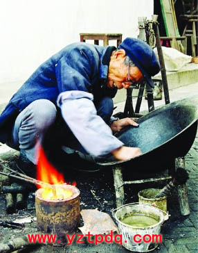 補(bǔ)鍋匠左手拉著風(fēng)箱,右手提過(guò)鍋,放在鋪有草木灰的地上,www.23um.cn用一只小巧玲瓏的鐵錘,在要補(bǔ)的四周輕輕地敲打。