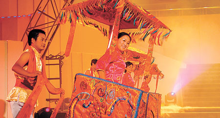流傳于高郵市車邏鄉(xiāng)一帶,距今約有在百多年歷史,是民間婚嫁迎娶習(xí)俗中表演的一種舞蹈。表演者人數(shù)可多可少,但不得少于8人。由4人扮轎夫,共抬1頂花轎;其余人員手拿各種樂器,既是舞蹈的表演者,又為吹鼓手?;ㄞI出門,途中以及把新娘迎娶到家,全過程不停地吹奏表演。主要舞步為跳踮卡、園場步等;隊形為串8字形、分8字形、絞麻花等。氣氛歡快熱烈。