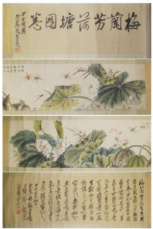 在馬維衡家中,他拿出了這幅珍貴的梅蘭芳手卷。展開一看,手卷長近4米,盡管年代久遠,但因主人保管得當(dāng),畫面上的顏色還是青翠欲滴。整幅畫卷看上去清新淡雅,荷花荷葉錯落有致。畫卷原本略長,但是在中間部位,點綴起幾只動態(tài)的蜻蜓,立刻就盤活了整幅畫卷,生機盎然起來。特別是梅蘭芳在綠色荷葉上的處理,更是濃淡皆宜,水墨洇染,顯示了深厚的中國水墨畫功底。在長卷的首尾處,都有當(dāng)代書法大家徐利明所題字,他也盛贊這幅畫作“皆入專家法門,無稍遜也。”