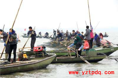 鞭炮聲中,40條漁船緩緩向湖中劃去,每條漁船上都有兩名漁民,一個(gè)負(fù)責(zé)劃船,一個(gè)負(fù)責(zé)罱魚。船行10分鐘左右,漁民們逐漸把船駛到湖中心。30分鐘后,在“圍長”的號(hào)令下,漁民向捕魚區(qū)域行進(jìn)并形成“殺圍”圈,掀起罱魚高潮,一條條碩大的魚兒漸離水面時(shí)騰空而起,伴著水花飛濺,一條條活蹦亂跳的魚被漁民擒獲。1小時(shí)后,40條船共罱魚800斤左右。一條重38.8斤、長1.3米的大青魚成為本次冬捕“殺圍”節(jié)個(gè)頭最大的魚,一舉拿下“頭魚”的稱號(hào)。