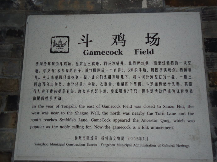 在揚(yáng)州東關(guān)街長樂客棧南邊、在壺園的北面,找到了“斗雞場”,巷子不長,還拐了個90度的彎,不留心就會找不到。