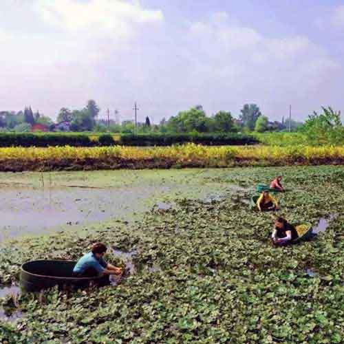 每當(dāng)秋季,邵伯鎮(zhèn)大小湖塘的水面上,全是碧綠一片,只見(jiàn)“叢叢菱葉隨波起,朵朵菱花背日開(kāi)”,像是鋪了一層翡翠,密密匝匝,簇簇?fù)頁(yè)?。采菱女漫身在木盆中,紅衣綠葉,暖風(fēng)美喉,如在畫中游動(dòng)。只見(jiàn),遠(yuǎn)處,碧波一湯漾,飛蜓野荷;岸上,壟田阡陌,煙村疏林;近旁,青菱白花,搖曵生姿,構(gòu)成了一幅秋日特有的旖旎圖畫,成了邵伯一道亮麗的風(fēng)景線。